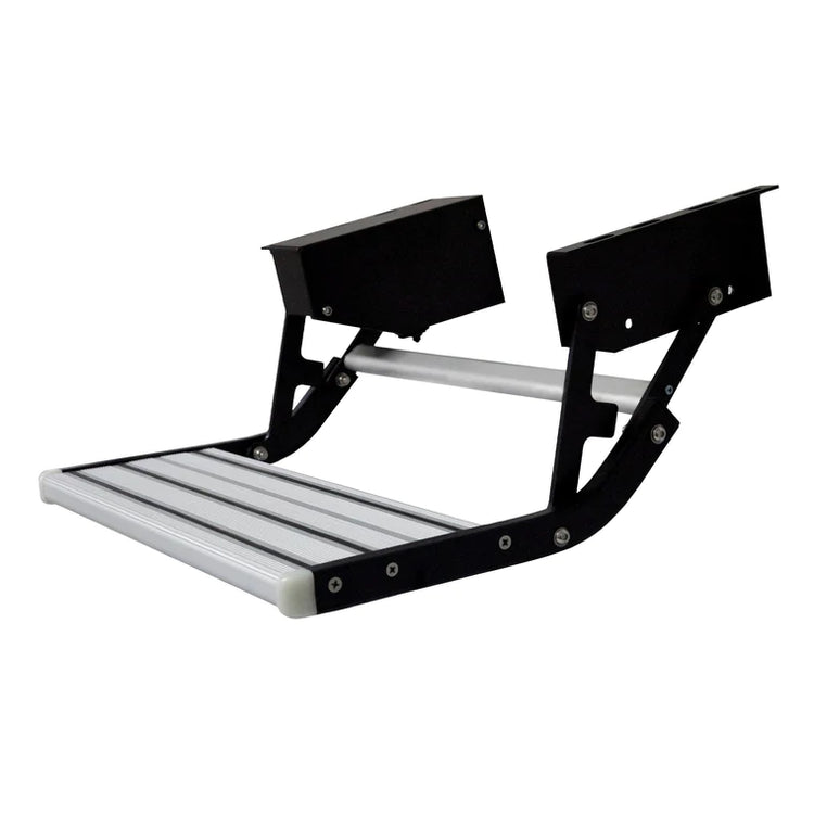 The Aussie Traveller 12V Drop Down Single step is designed for functionality, safety and style. Light weight but strong construction using powder coated steel brackets and aluminium, anti-slip treads with stainless steel springs and fixtures.