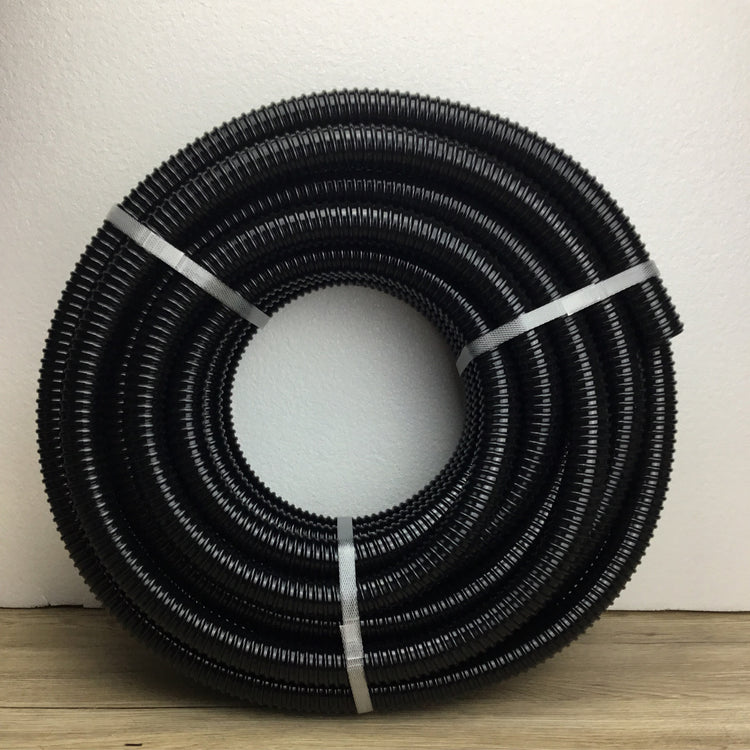 Corrugated Hose, Black smooth bore, 27mm ID, 10m roll. Used for drainage or sometimes for tank inlet. Very flexible and retains its shape for tight turns. This gives a better fit to 25mm barb fittings without the need to heat the hose.