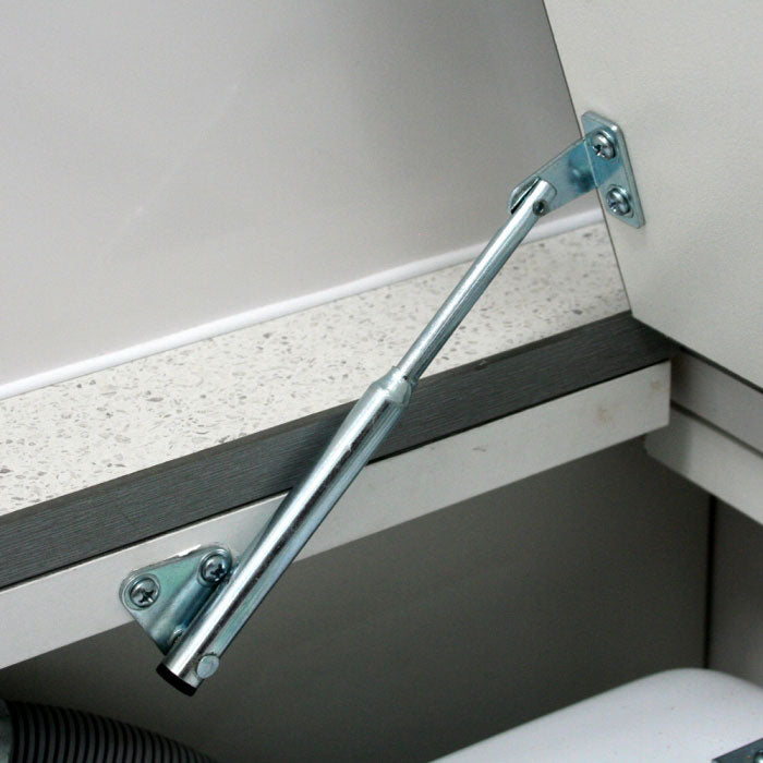 Cupboard stay, Spring loaded, dual pivot, Silver, 130m. A strong, spring loaded stay ideally suited for supporting top hinged overhead cupboard doors in the open position. Features a flat swivel bracket at one end and an angle swivel bracket at the other end.