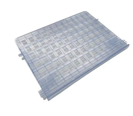 The clear plastic lower fridge shelf includes sliding locks to keep the shelf in place. The sliding locks also allow the shelf to be rotated to enable removal.