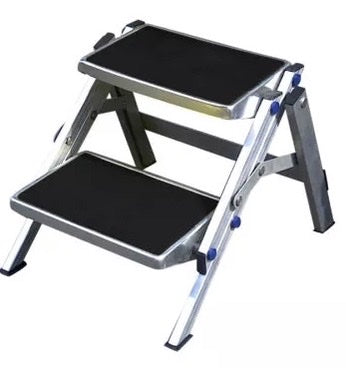 This is a light weight (3.8kg) double step, that easily folds flat for storage but is rated to hold 150kg.