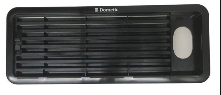 Dometic Fridge vent, Large upper vent insert, current style. This upper vents fits into the upper mounting frame for the Dometic fridge vent. When inserted, it covers the mounting frame screw heads and accepts the right hand flue vent insert. The small clip on the left is included, but the right vent insert is a separate item.