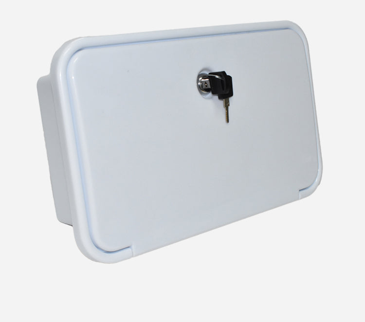 A lockable external shower unit with hot and cold mixer taps, perfect for cleaning up before entering your RV.